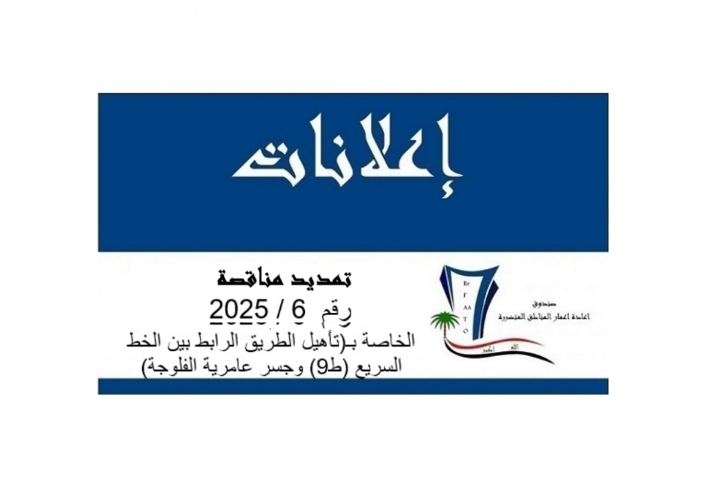 1 | تمديد مناقصة 6 / جدول هـ / 2025 تاهيل الطريق الرابط بينالخط السريع ط 9 وجسر عامرية الفلوجة | تحميل الملف |
