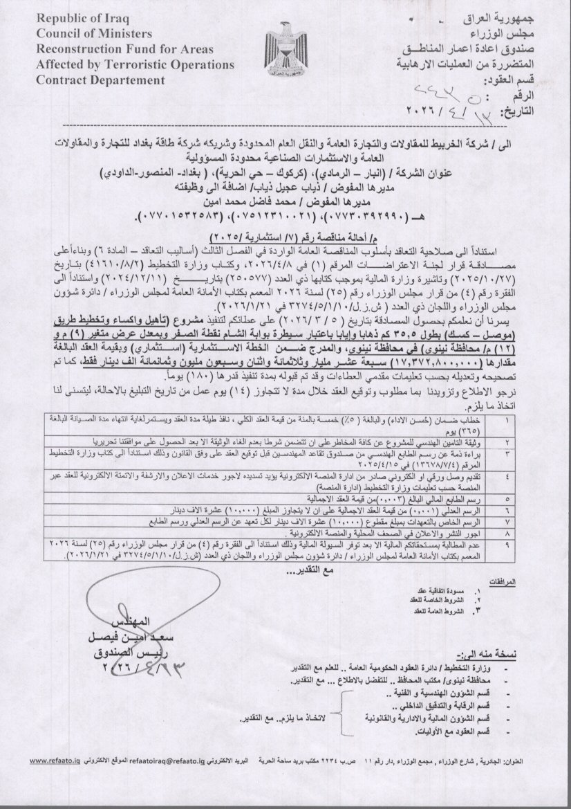 احالة مناقصة ( تاهيل واكساء وتخطيط طريق (موصل - كسك) بطول 35,5كم ذهابا واياباً باعتبار سيطرة بوابة الشام نقطة الصفر وبمعدل عرض متغيير (9)م و (12)م / محافظة نينوى